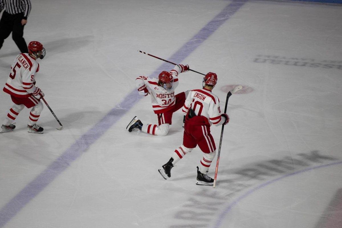 Eiserman speeds up after he scores. He wheels around the goal, stick pointed to the rafters, then unbuckles the chinstrap of his helmet and raises both arms at the Agganis Arena stands. The man who, just a couple hours earlier, sat on the bench and eliminated all possible distractions is now almost begging the fans to acknowledge him. These outpours of emotion are not uncommon.