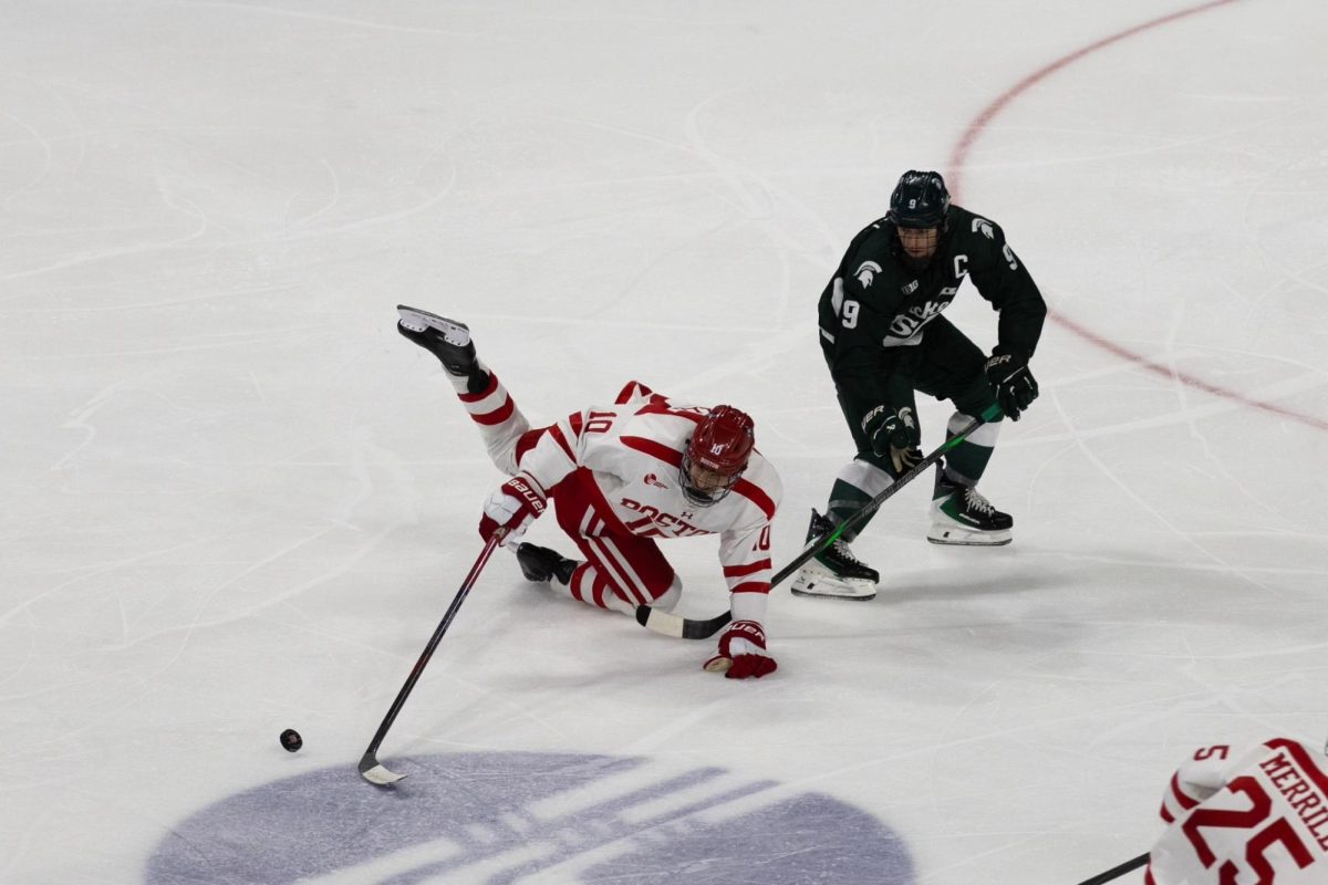 On a 2-on-1 in overtime, sophomore assistant captain Cole Eiserman rifled a shot that squeaked past sophomore goaltender Trey Augustine. As the puck trickled toward the goal line, sophomore Michigan State forward Shane Vansaghi swiped it away just before it fully crossed. Eiserman thought he’d scored the winning goal.