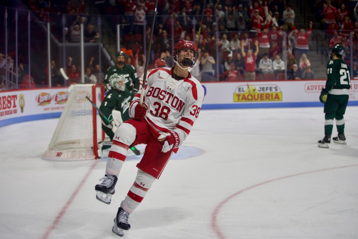 Spartan freshman forward Ryker Lee corralled a loose puck entering the Michigan State offensive zone. On a 2-on-1 rush the other way, he fed senior defenseman Matt Basgall, who blasted one home, lifting the Spartans over Boston University men’s hockey, 4-3.